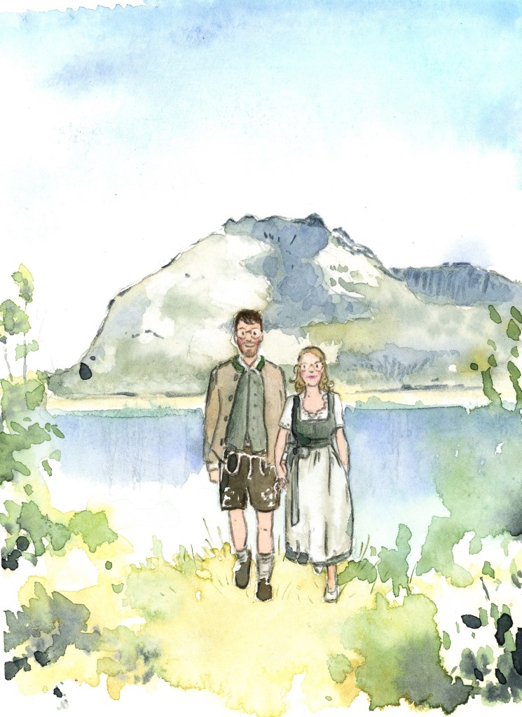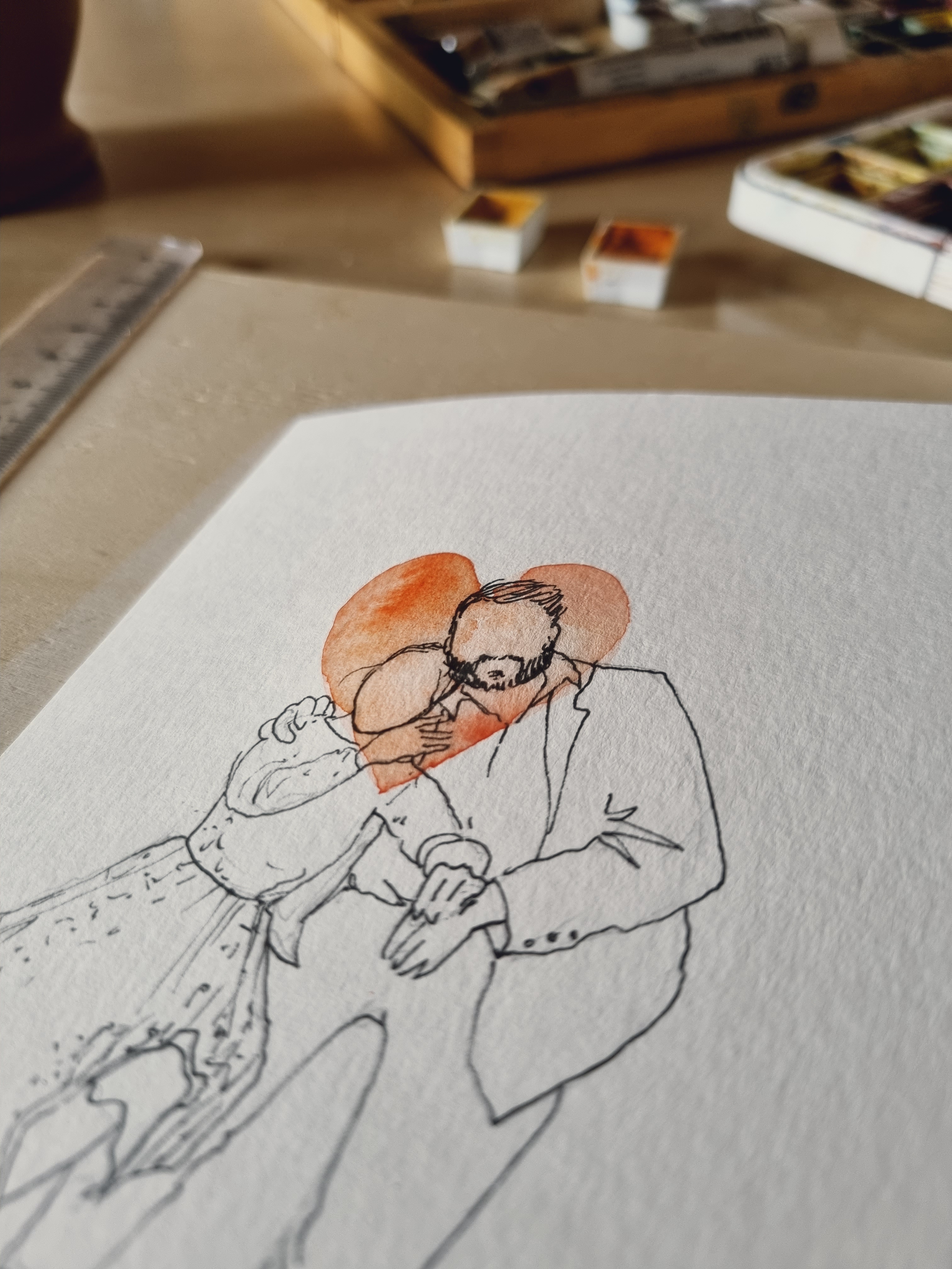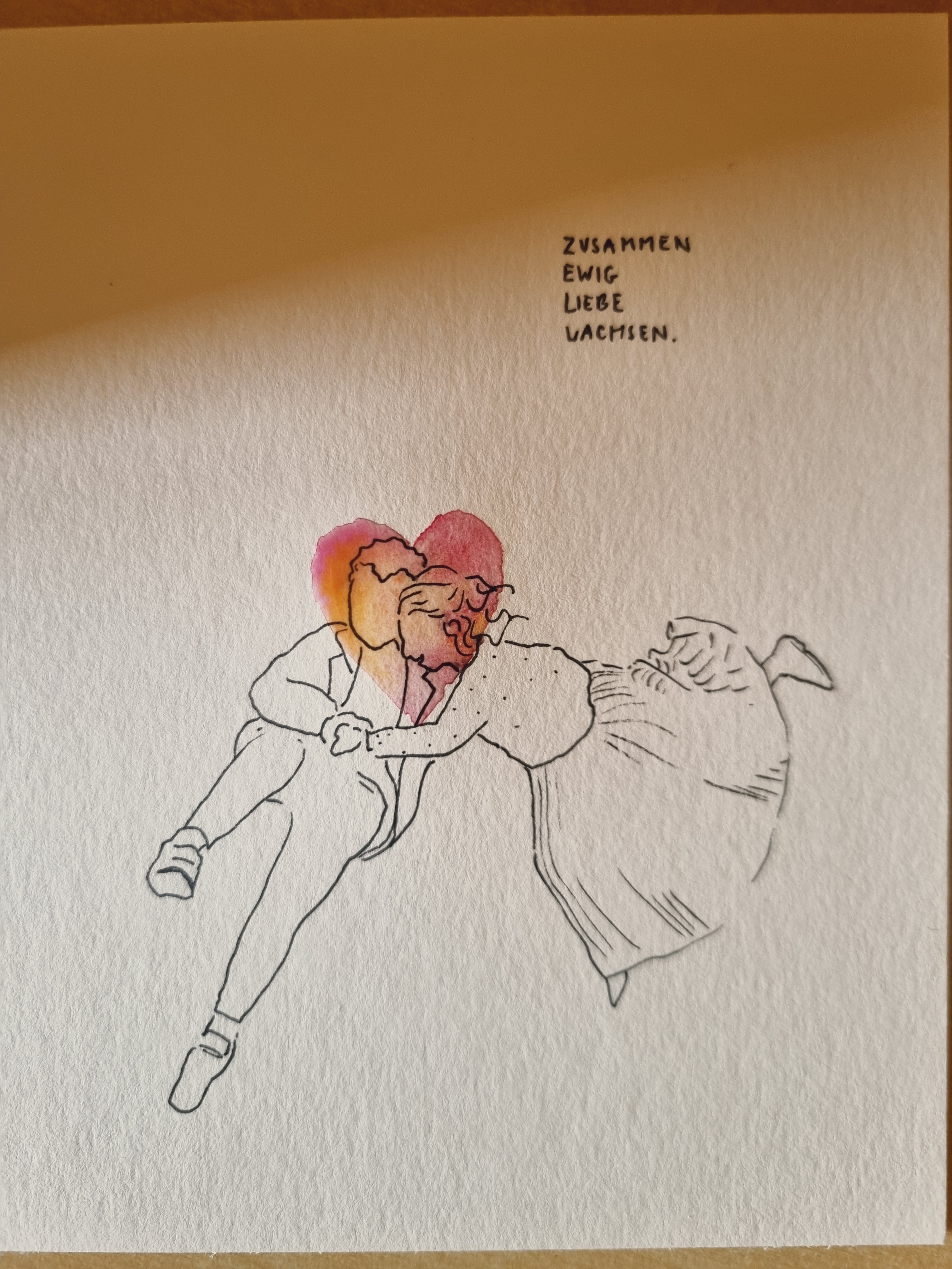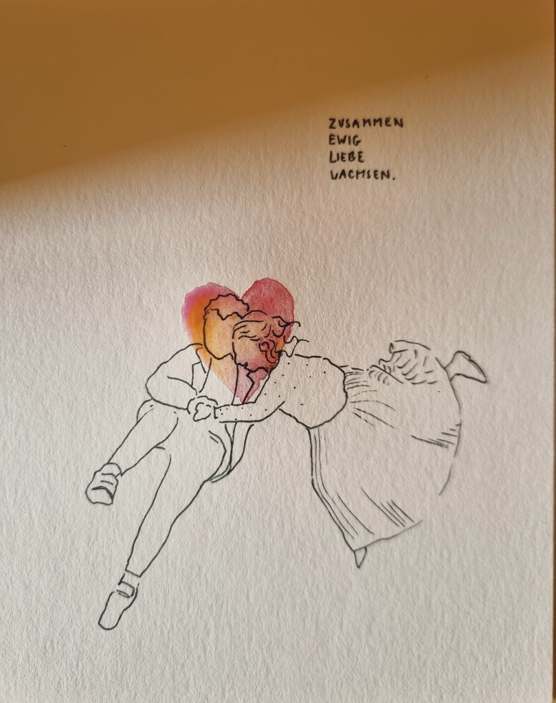 Beispiel Hochzeit: besonders beliebt ist dabei eine minimalistische Zeichnung des Paars mit einem Aquarellherz und vier Schlagworten, die die Verbindung charakterisieren.