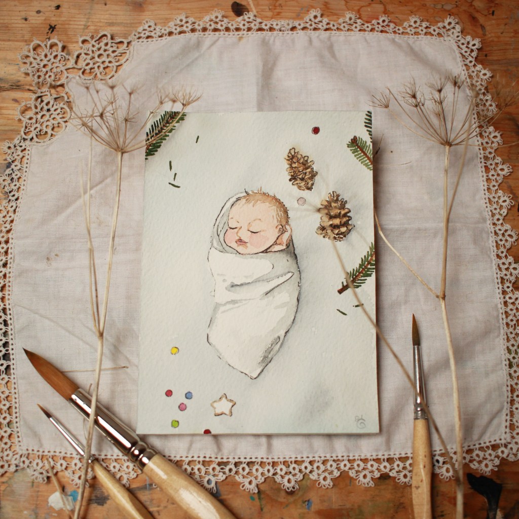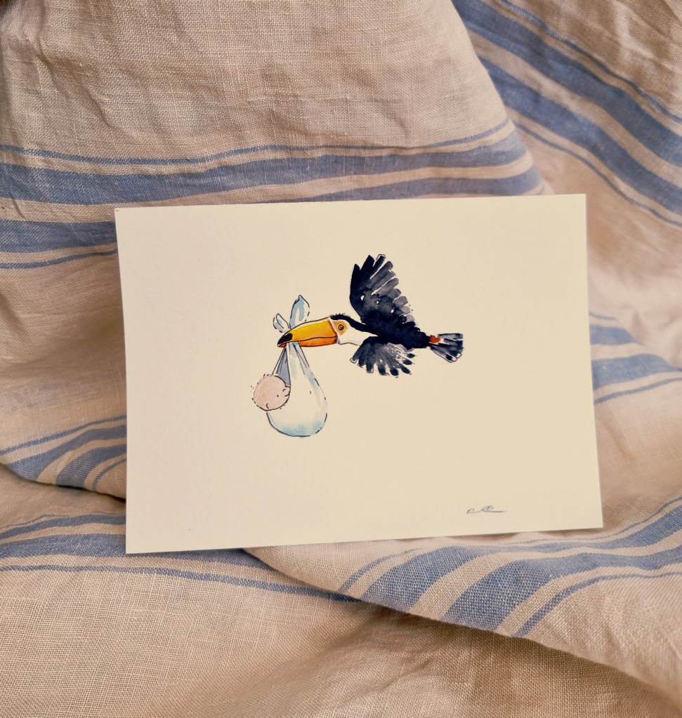Beispiel Geburt: Ob ein spezieller Vogel als Bote oder ein kleines Babyporträt, auf alle Fälle eine sehr originelle Babykarte.