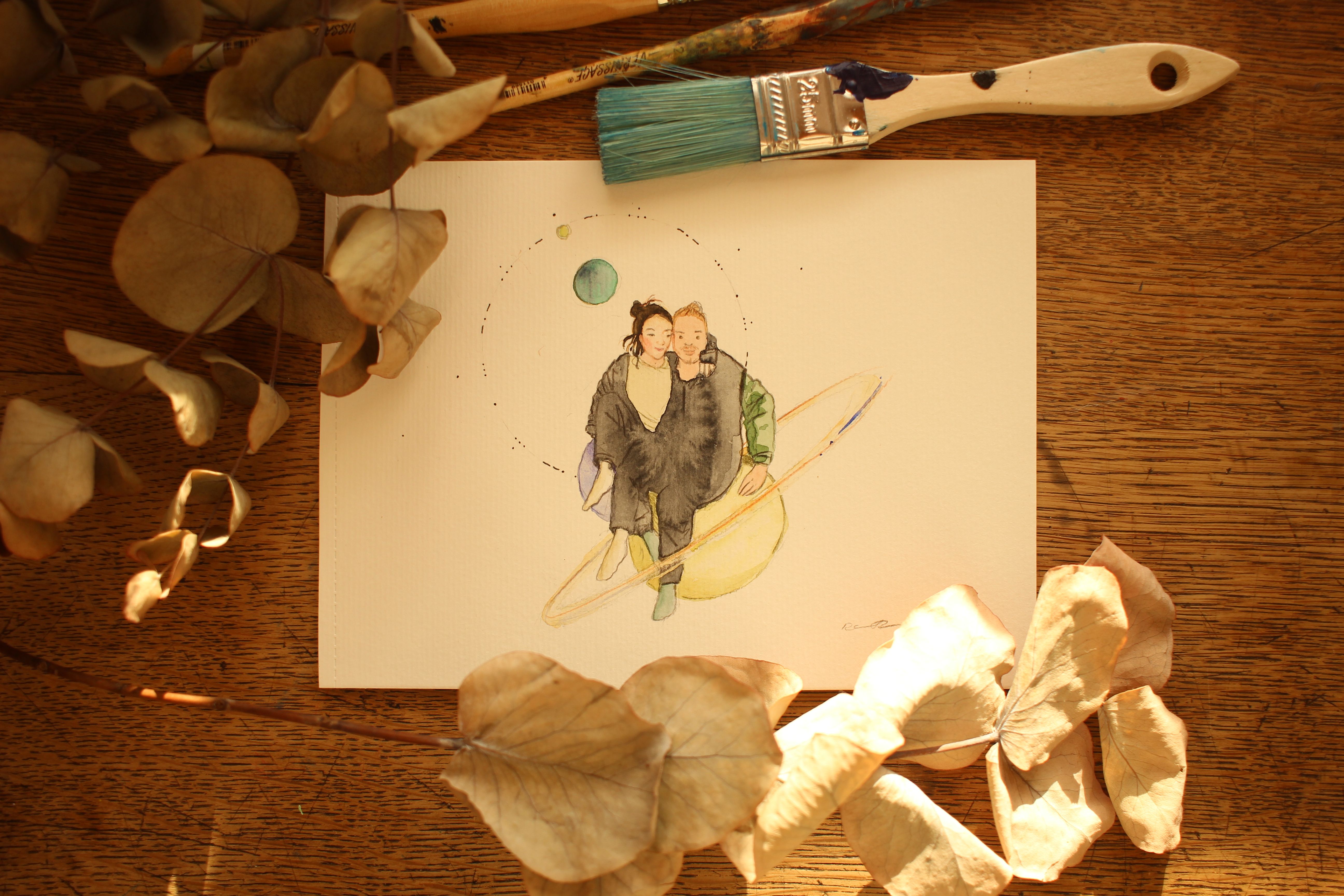 Ablauf: Als erstes unterhalten wir uns, wie du dir das Porträt vorstellt (Größe, wie viel Personen, Technik, digital oder analog, mit oder ohne Hintergrund). Dann brauche ich Foto(s) der zu porträtierenden Personen. Daraufhin fertige ich eine Vorskizze, die, falls ihr zufrieden seid, weiterausgearbeitet wird bis zum fertigen Bild.